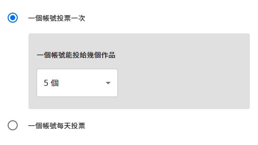 投票可設定活動期間只限投票一次或每日皆可投票,並可設定一帳號能投給幾個作品