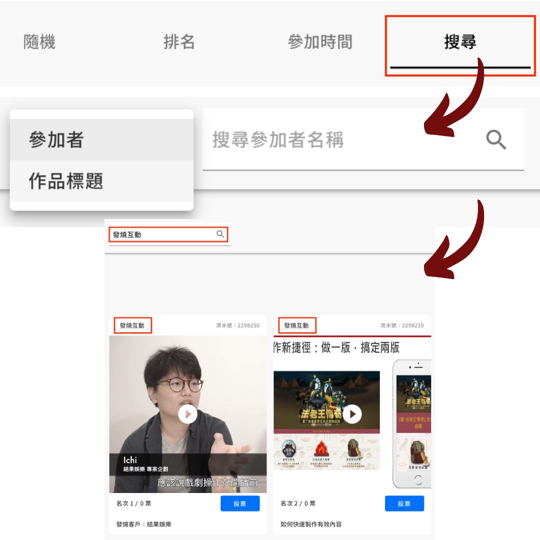 前台提供搜尋功能,可依據參賽者名稱或作品標題作搜尋