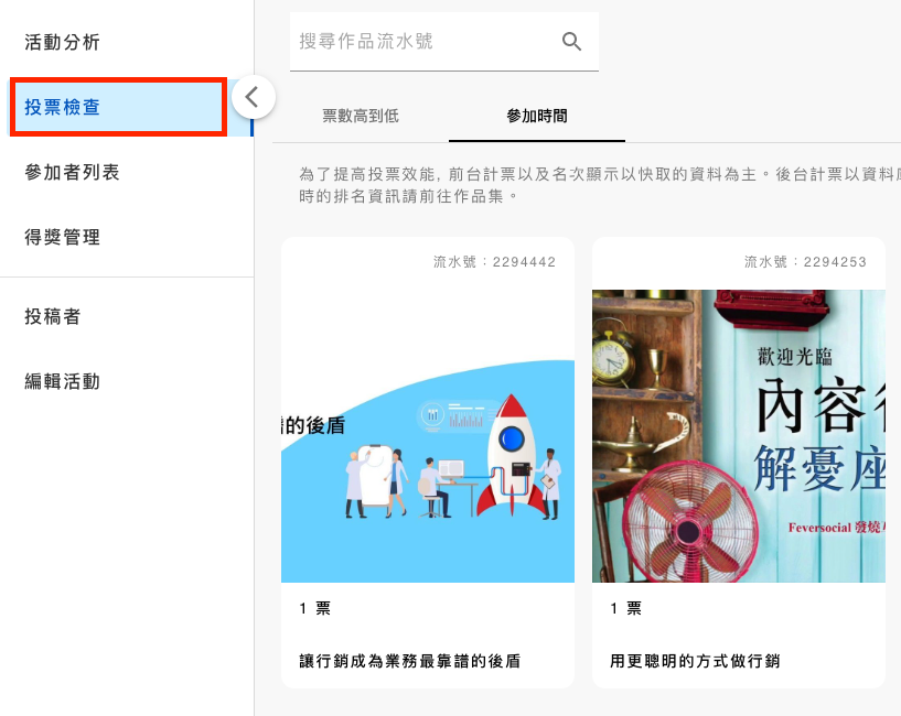 在後台的「投票檢查」中,可以一覽所有作品的得票狀況。每件作品,可以深入檢視每日投票的圖表,以及所有投票者的帳號和 IP,並可直接取消有疑慮的票數。