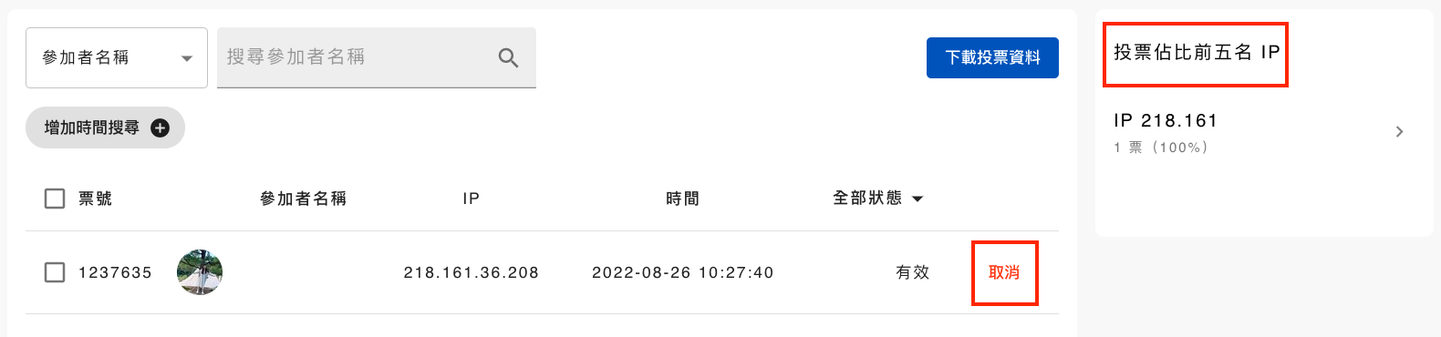 可針對有疑慮的票數做出「取消」,也可透過「投票佔比前五名 IP」查看投票是否有異常狀況