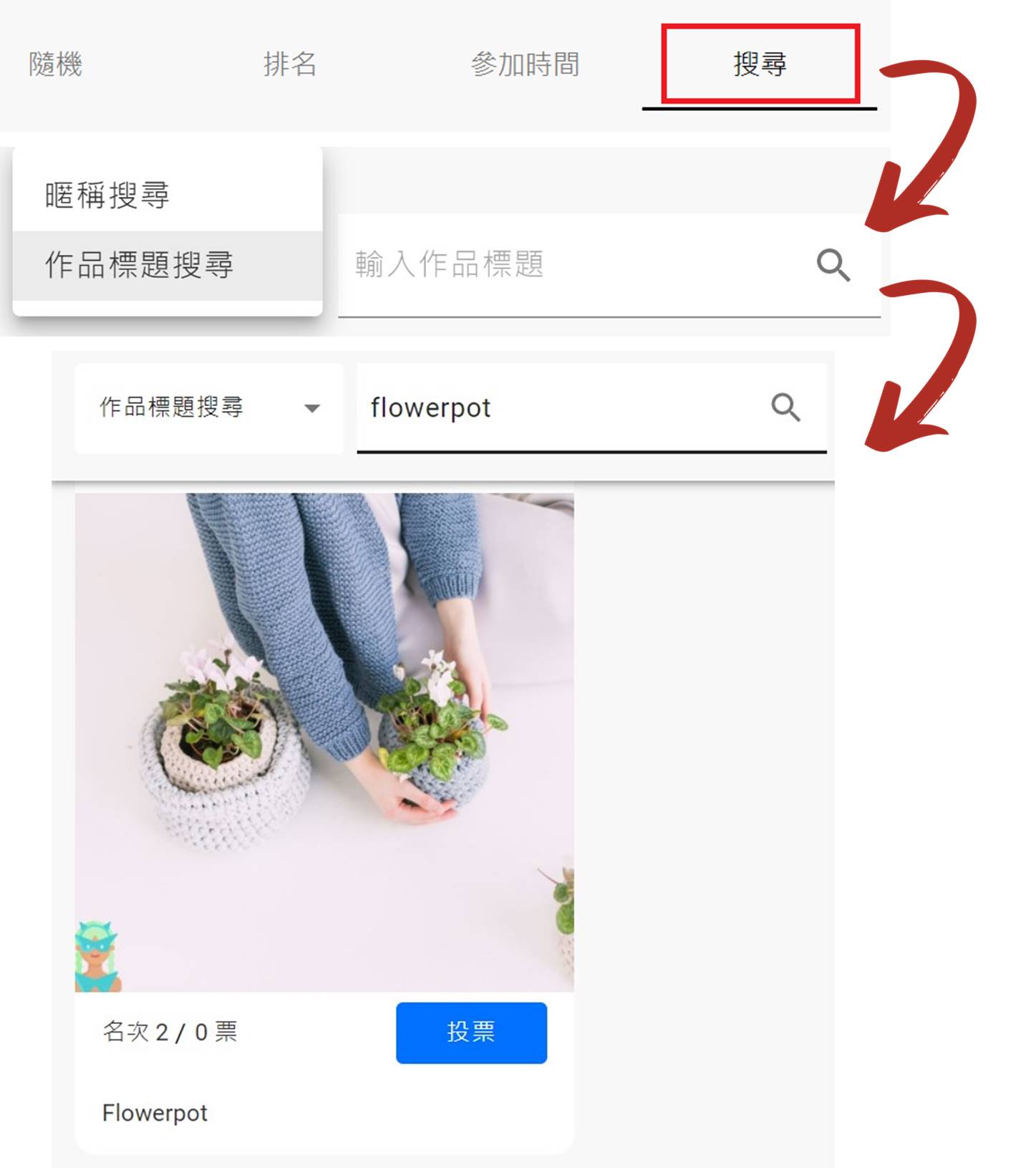 前台提供搜尋功能,可依據參賽者名稱或作品標題作搜尋