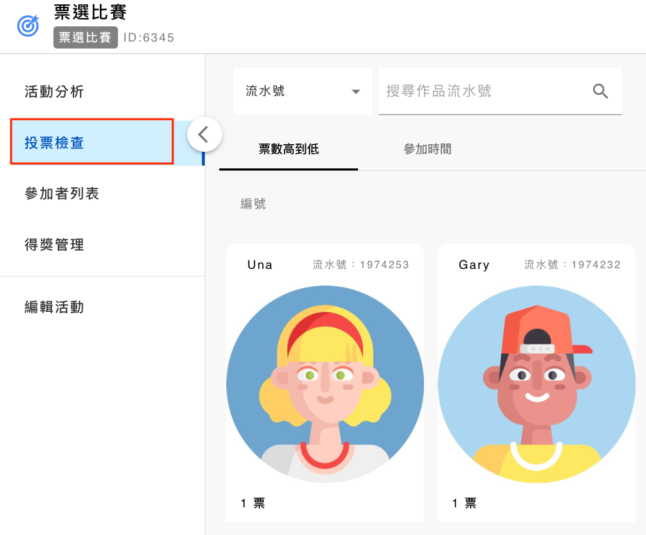 在後台的「投票檢查」中,可以一覽所有作品的得票狀況。每件作品,可以深入檢視每日投票的圖表,以及所有投票者的帳號和 IP,並可直接取消有疑慮的票數。