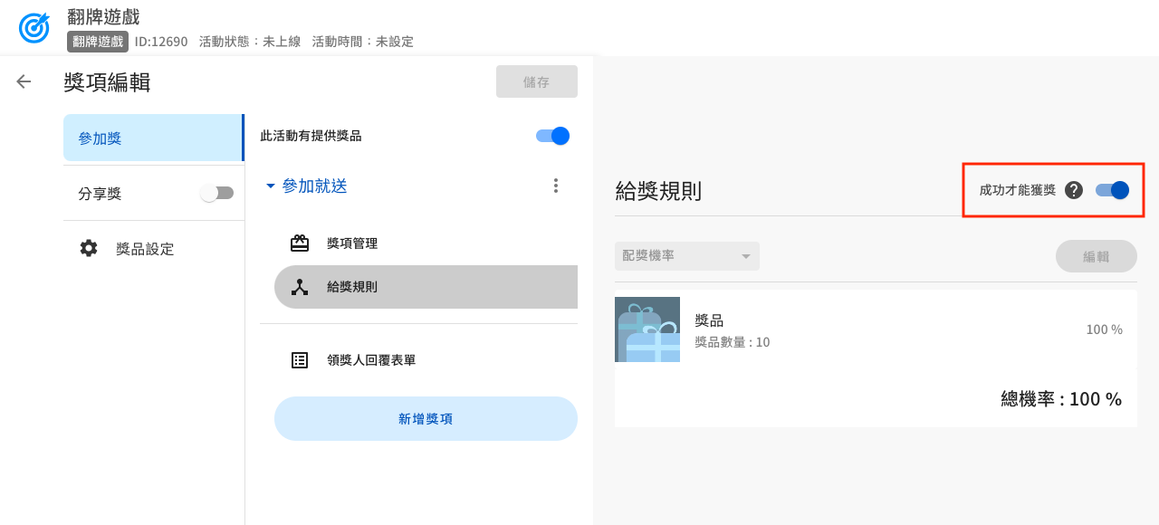 如果想讓活動獎品給真正的粉絲、忠誠用戶、用心參加活動的 user,你可以在編輯獎項時,打開「成功才能獲獎」的限制;如此一來,參加者必須全部翻對才能獲得遊戲配獎或抽獎機會唷!