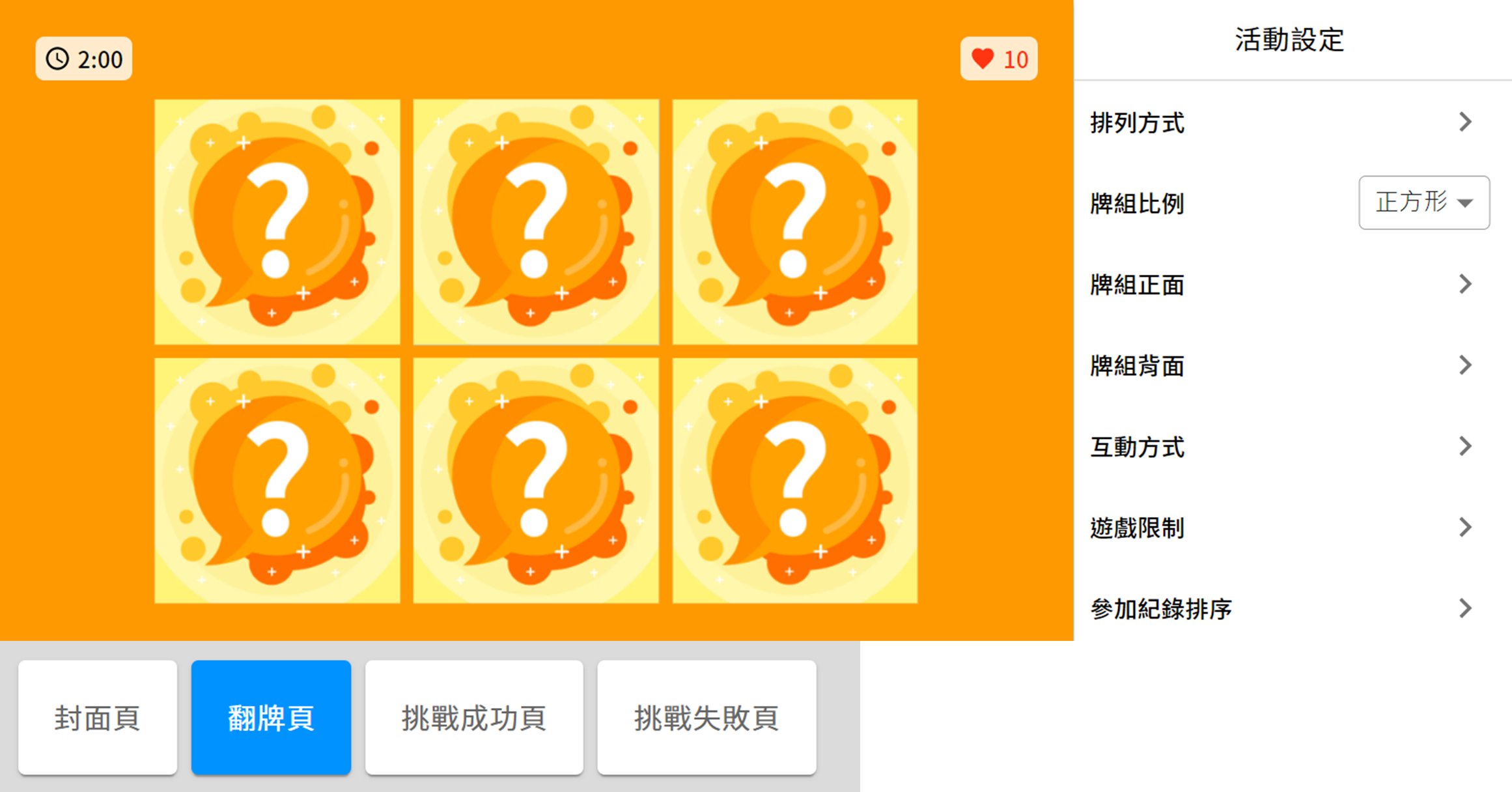 翻牌頁 ─ 排列方式、牌組樣式等皆可進行設計