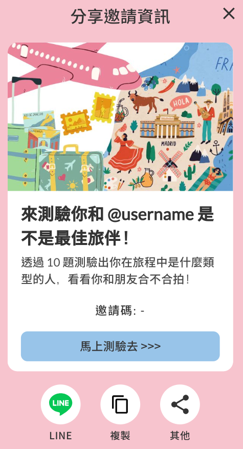 幫邀請者設計吸睛的LINE分享卡片,從視覺呈現、文案內容到按鈕都可自行調整設計;系統會自動帶入邀請者的社群名稱,讓訊息更增添親切感。