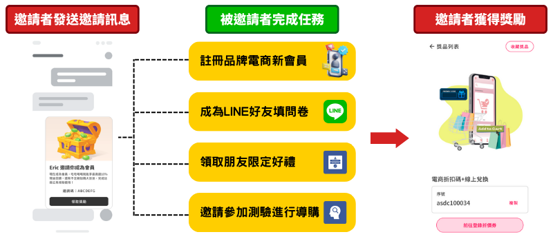 品牌本身如有手機 APP、電商的會員體系或經營 LINE,也可以藉由 OCEP 系統串接,完成更有層次的新客招募策略,例如:邀請朋友加 LINE好友拿專屬優惠券、註冊新會員填問卷領取試用包兌換券、或下載 APP 領取點數等。