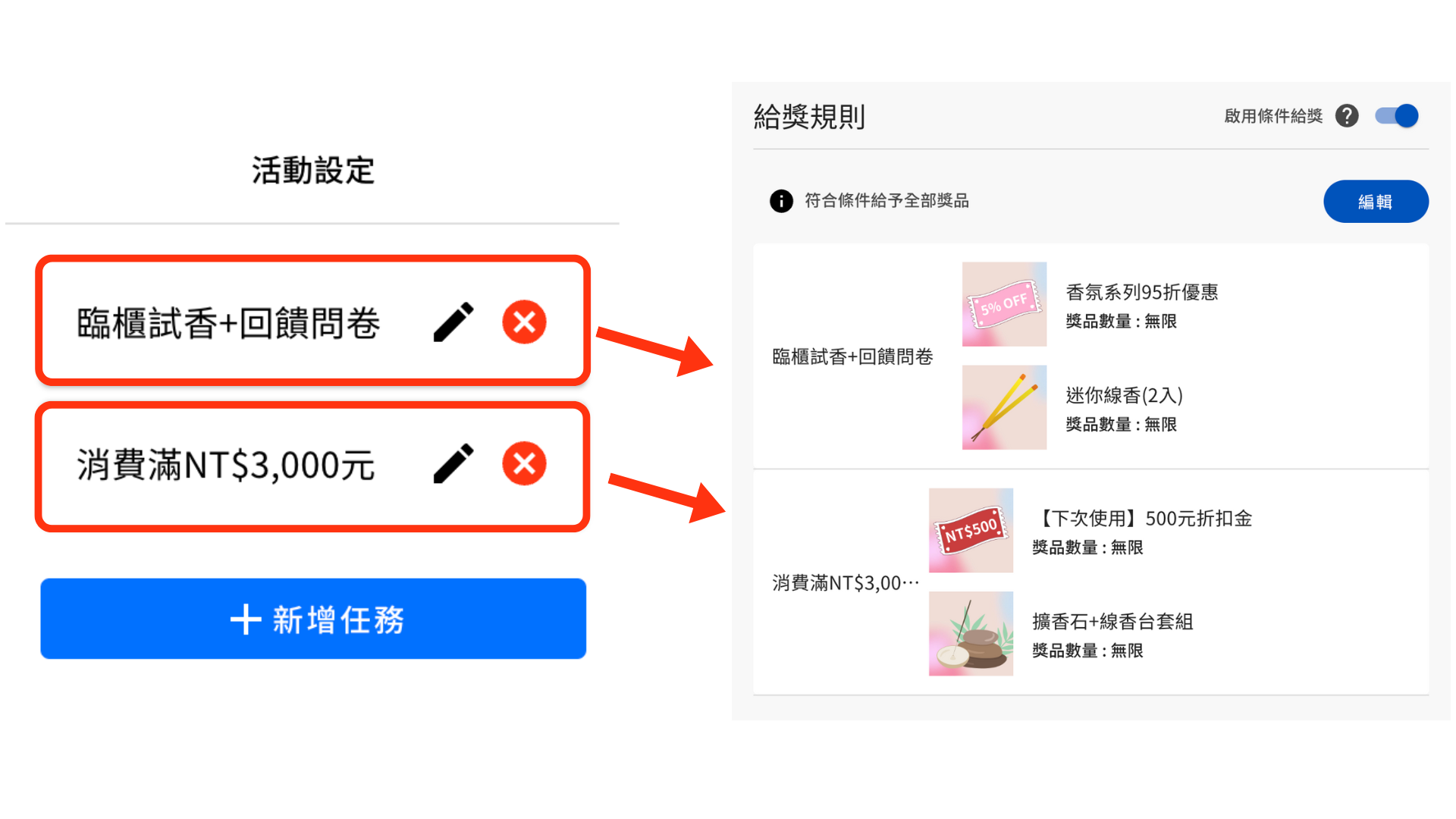 品牌可開啟「條件給獎」功能,依照不同任務派發對應的獎勵內容,系統會根據顧客實際任務完成狀況,即時派發對應的獎勵,讓派獎更精準、更貼近顧客的需求跟喜好!