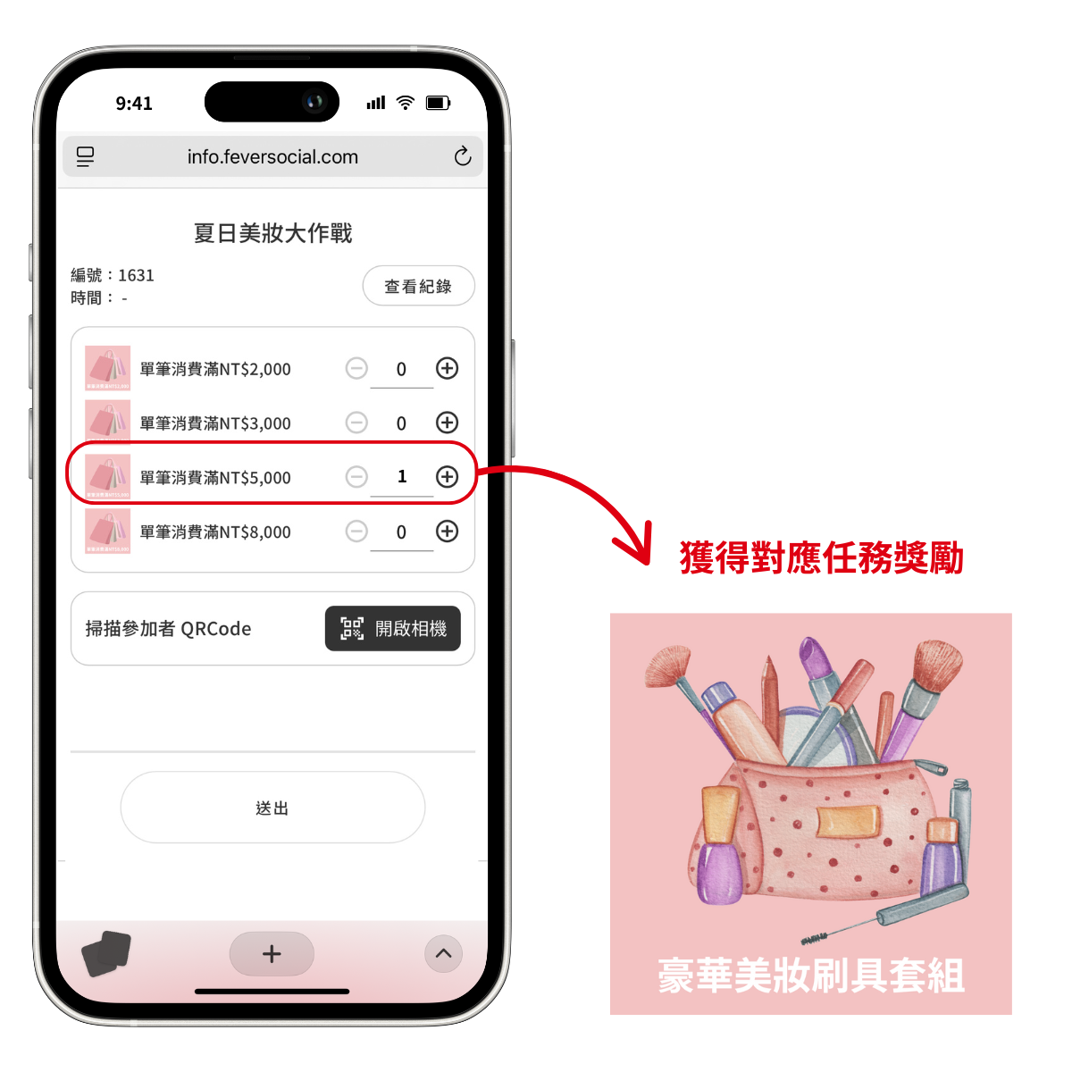 透過實體工作人員用平板或手機掃碼為顧客審核任務並派獎。可搭配點數獎勵打造集點制度,強化再次參與及回訪誘因!