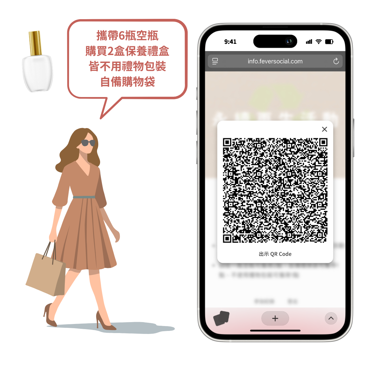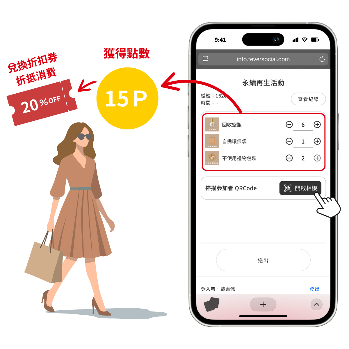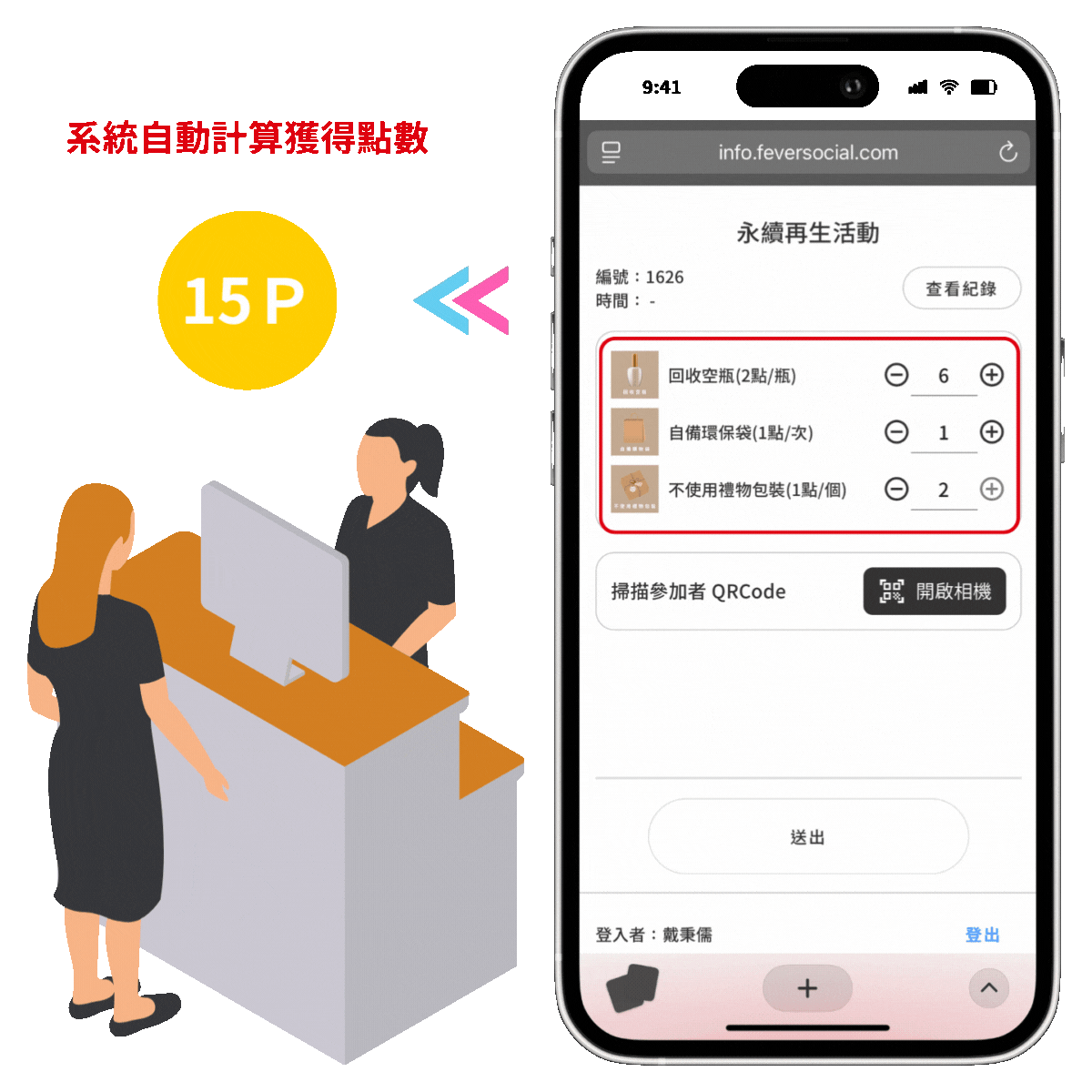 顧客參與永續公益行動後,出示QRCODE供門市人員掃描