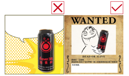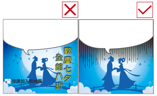底圖的情境、互動設計都必須很簡單明瞭,不需再放和情境無關的文字,例如「按讚加入粉絲」、「全館打折」等。試著把你想寫入的文字圖像化吧!