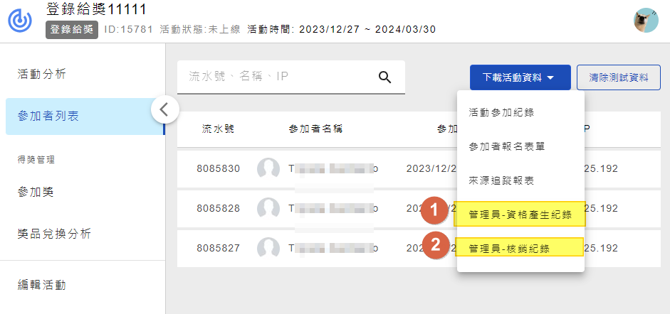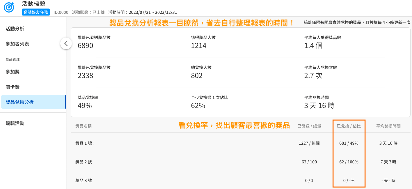 可從分析報表快速判斷獎勵兌換的情形,同時提供下載實體工具的兩種功能操作紀錄