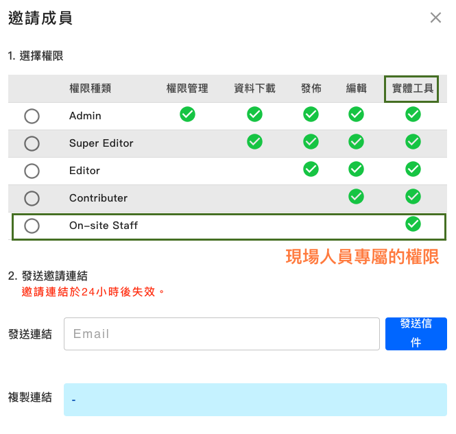 後台管理員可幫不同門市及每位門市人員設定小幫手使用權限,可賦予全部或單一活動管理工具權限,靈活支援多分店活動操作