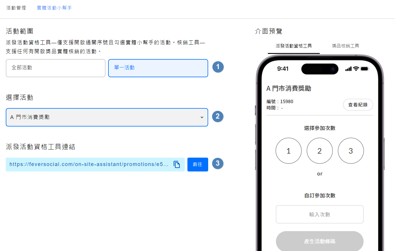 ✔ 有了小幫手,你不需印刷紙本券卡、做道具、或串接POS機,即可由工作人員設定客人應得的遊戲次數。