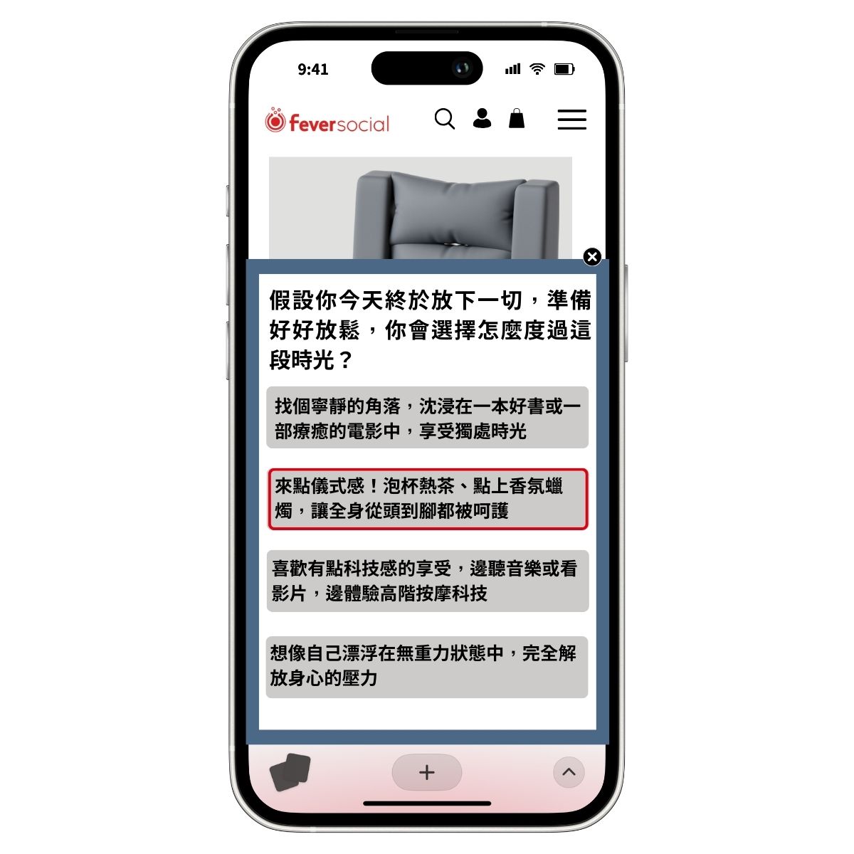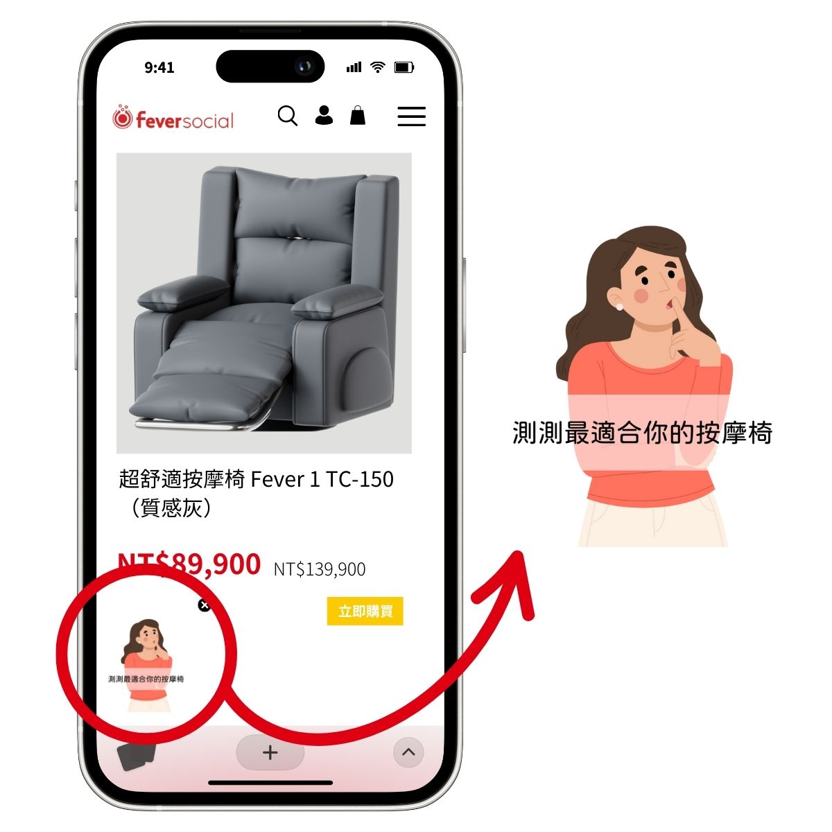 訪客搜尋按摩椅進到品牌的商品頁,於頁面左下角跳出銷售顧問樣式的「浮動按鈕」