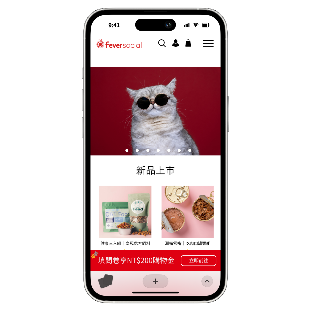 訪客到寵物用品網站時,在下方跳出「提示橫幅」提醒他們填問卷可以領取購物金