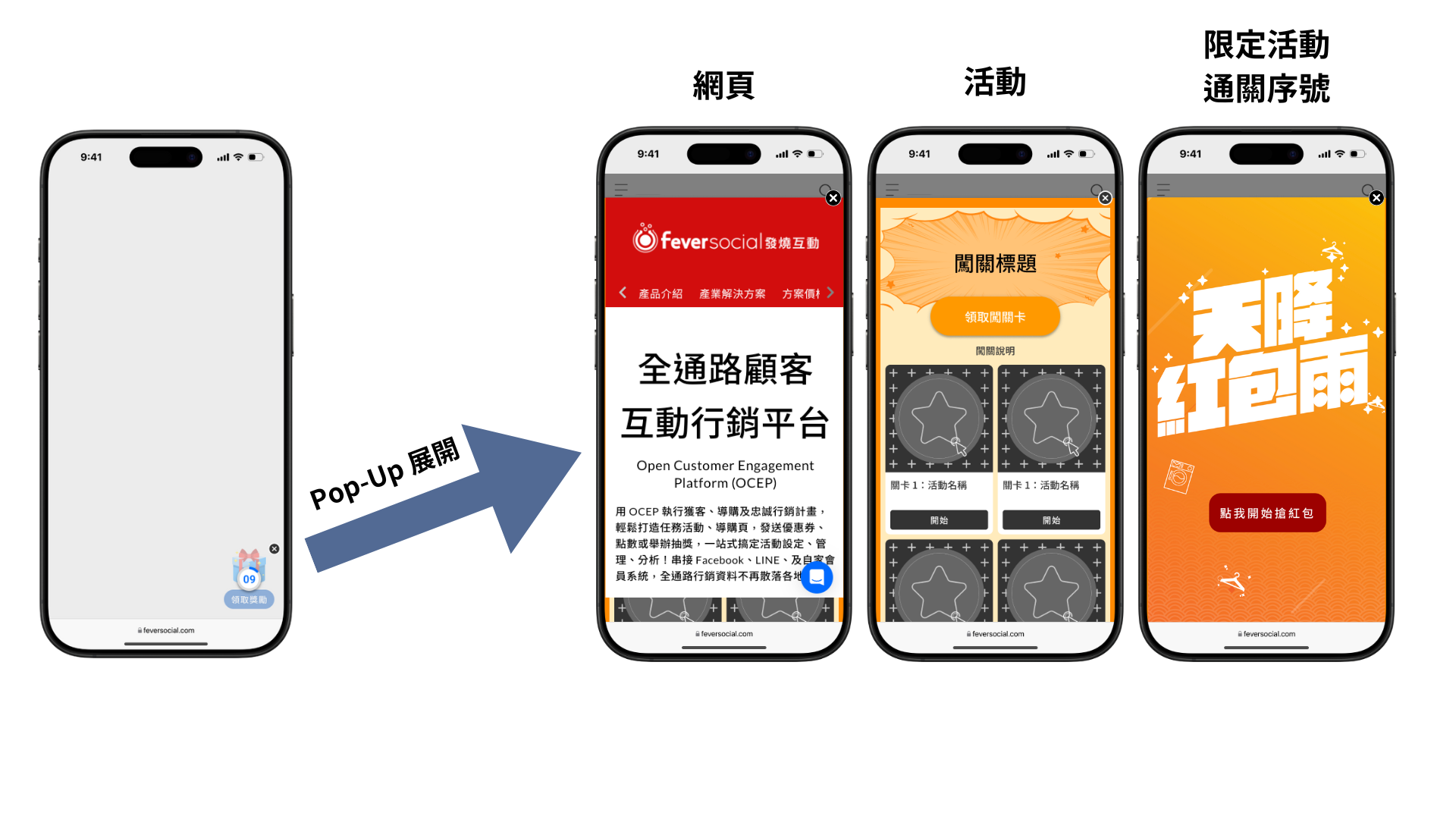 Pop-Up能在原頁開啟發燒互動20+種活動,透過遊戲化互動手法及獎勵機制提高訪客參與度,延長停留時間並促進轉換!