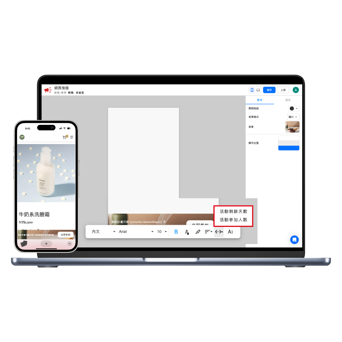 我們的網頁推播也可自動帶入即時的活動參數,包括「活動剩餘天數」與「活動參加人數」,巧妙運用FOMO與從眾心理,有效驅動顧客參與意願!