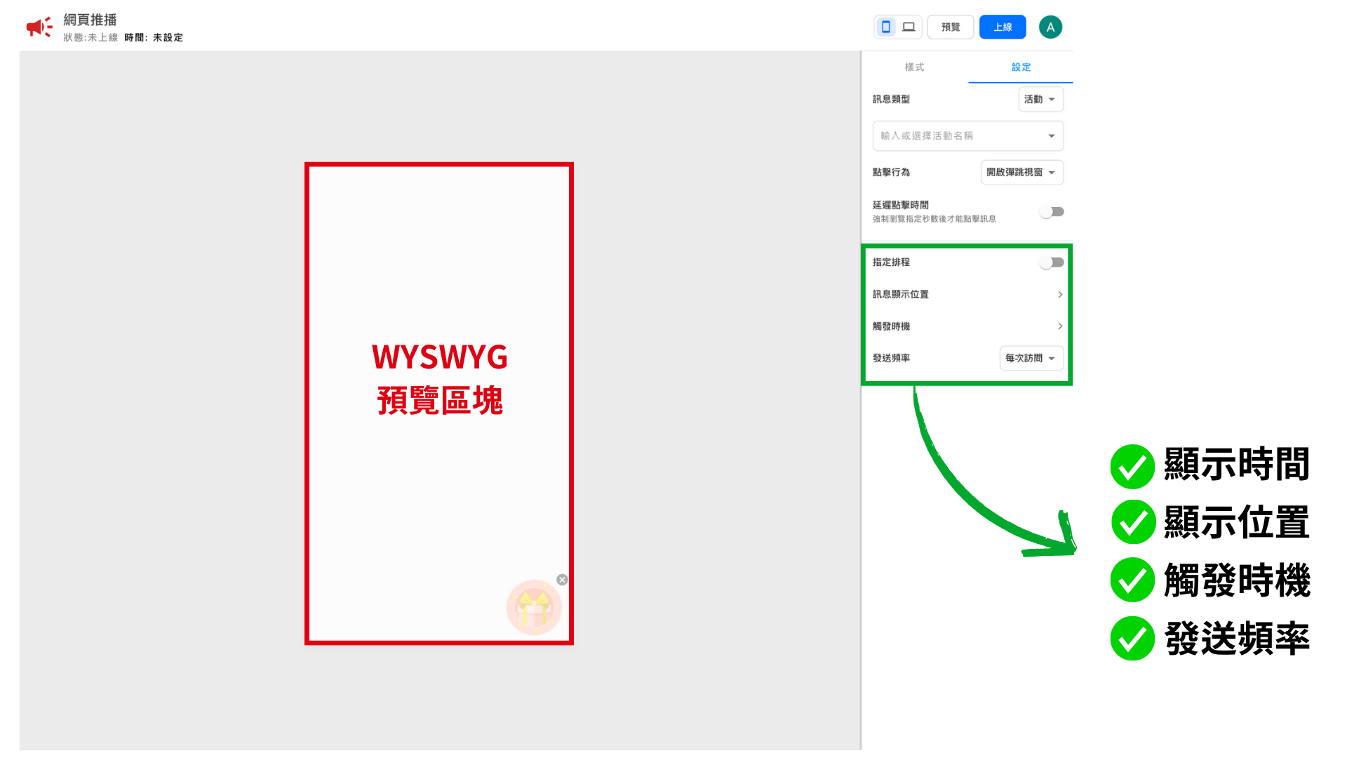 可自由設定點擊後的顯示時間及位置與觸發時機及頻率,確保每則推播訊息在最佳時刻呈現、不過度打擾,精準提升目標顧客的體驗與互動率!