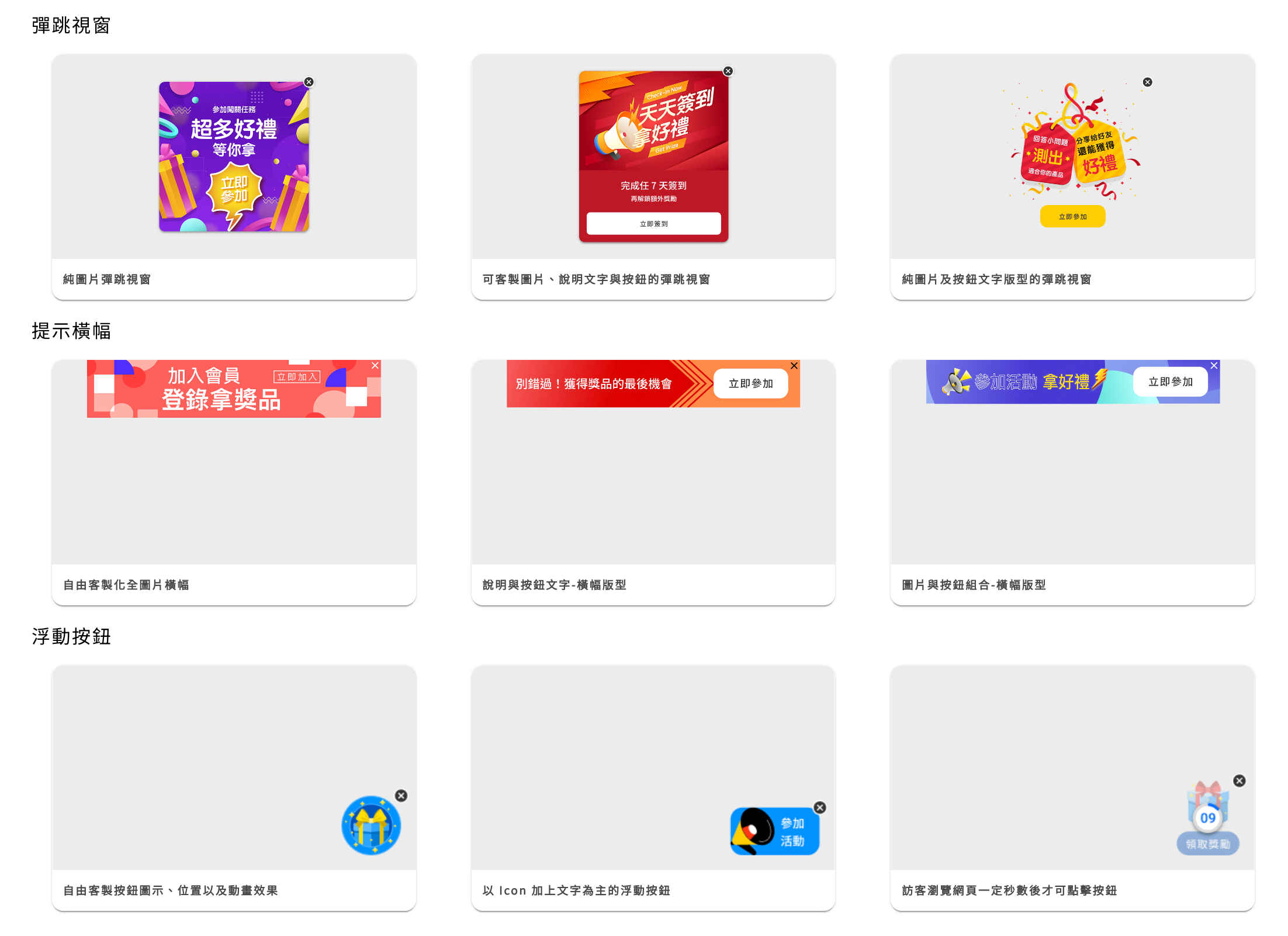 支援JPG、JPEG、PNG、GIF, 適用於輕量且不過度打擾顧客的情境,例如:小範圍通知或簡單提醒訪客行動,簡潔明瞭快速引導訪客點擊!