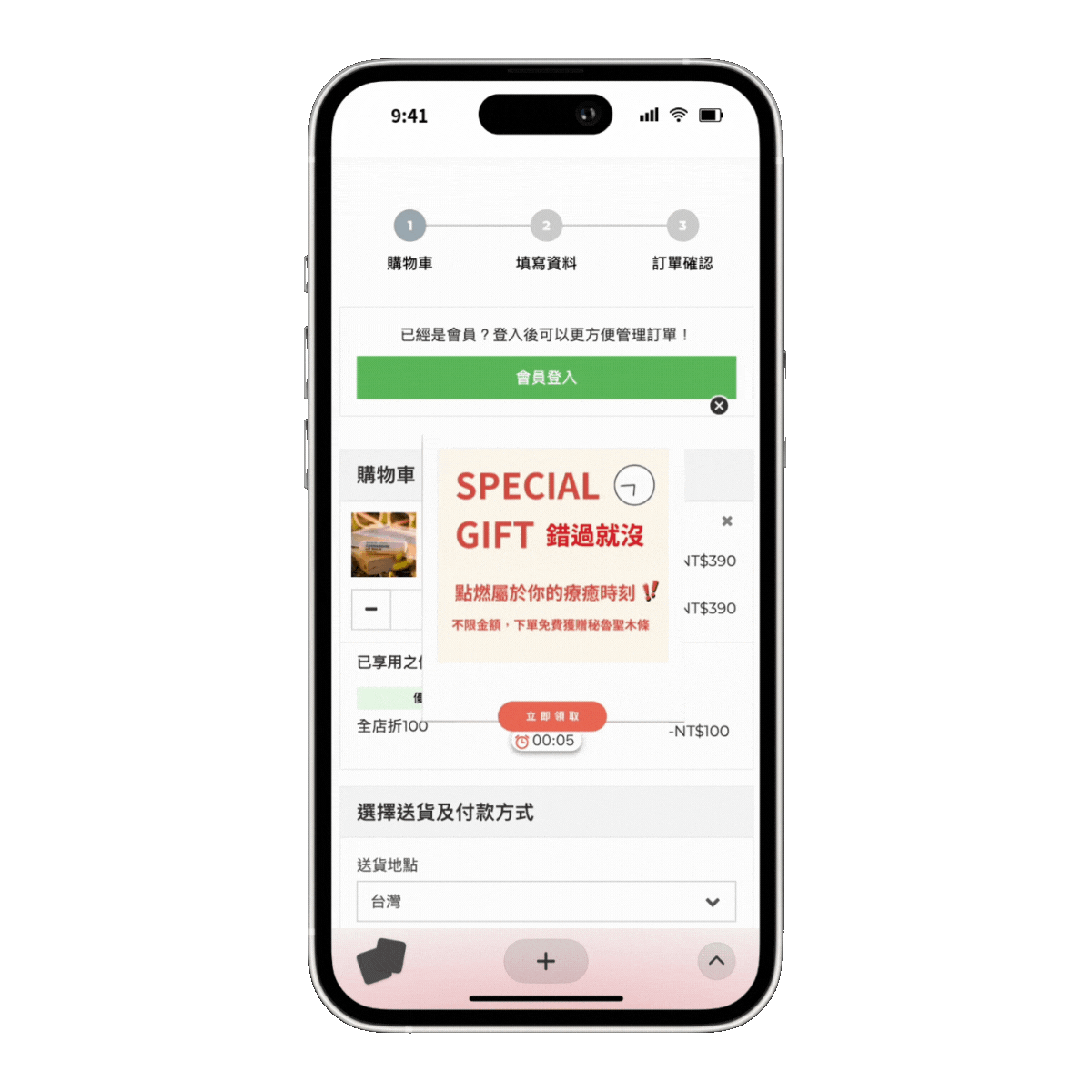系統可偵測訪客有「離站意圖」,即時彈出活動或優惠訊息,攔截即將流失的潛在顧客,可搭配限時/限量折扣或專屬獎勵,創造「再看一眼」的誘因,抓住最後的轉換機會!