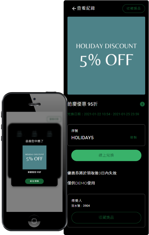 不同獎品類型可自行搭配出「寄送贈品」、「O2O實體店鋪兌換券」、「線上EC折價券」、「不重複序號獎」等多種應用情境。 實體兌換的序號系統會產生QR code方便門市人員掃描。如果你的網路商店接受序號,也可以在優惠券設定兌換網址。需要寄送的獎品,可以使用得獎人表單自訂需要收集資料欄位。