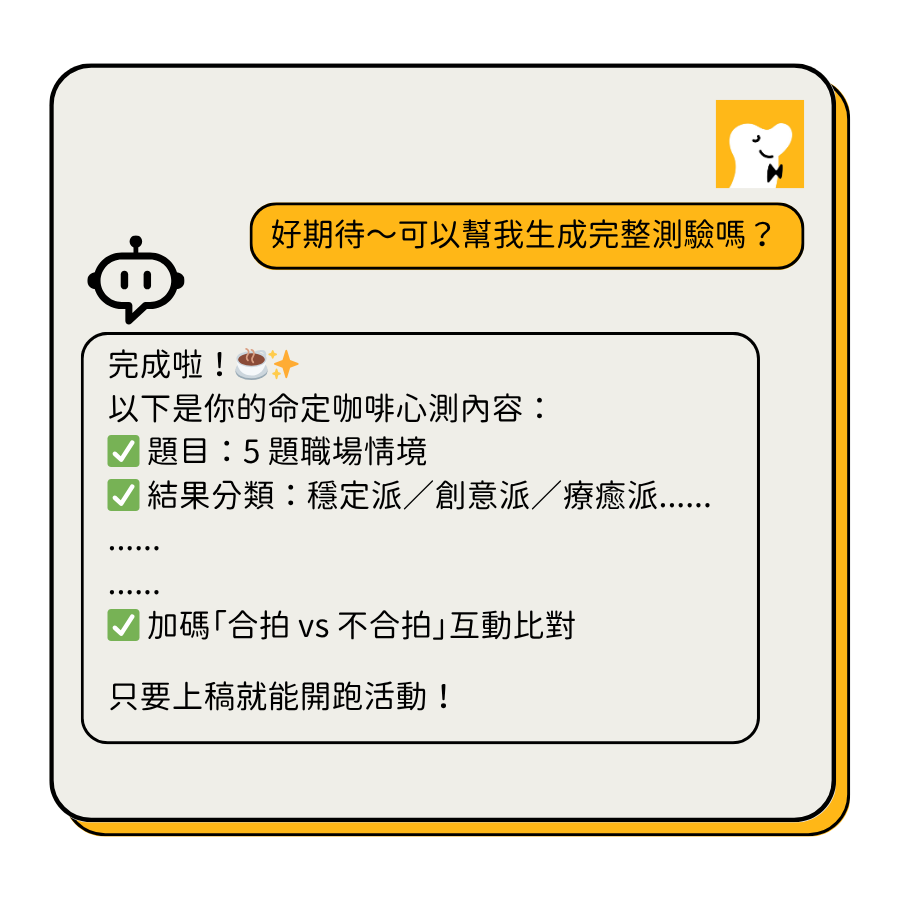 發燒互動的 AI 心測產生器,就像你的專屬行銷企劃師,透過簡單對話,就能幫你快速產出完整心測企劃腳本。