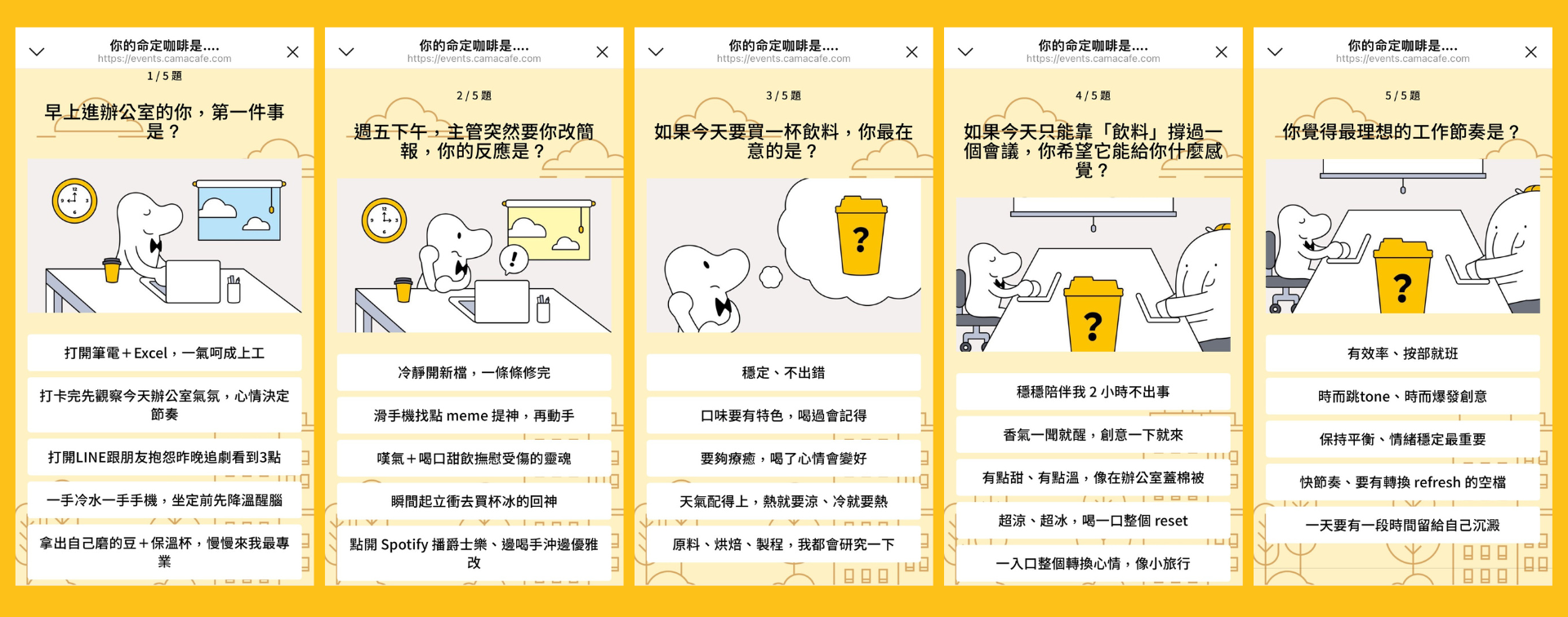 CAMA Cafe平常在門市觀察到一個經典場景,客人站在櫃檯前面,看著菜單猶豫很久:「今天要喝什麼?」這樣的「選擇障礙」本身就很適合當作心理測驗題材。所以行銷團隊把這個痛點變成互動題材,想用輕鬆的心理測驗,幫助消費者探索當下適合喝的飲品,同時讓品牌順勢介紹不同品項。