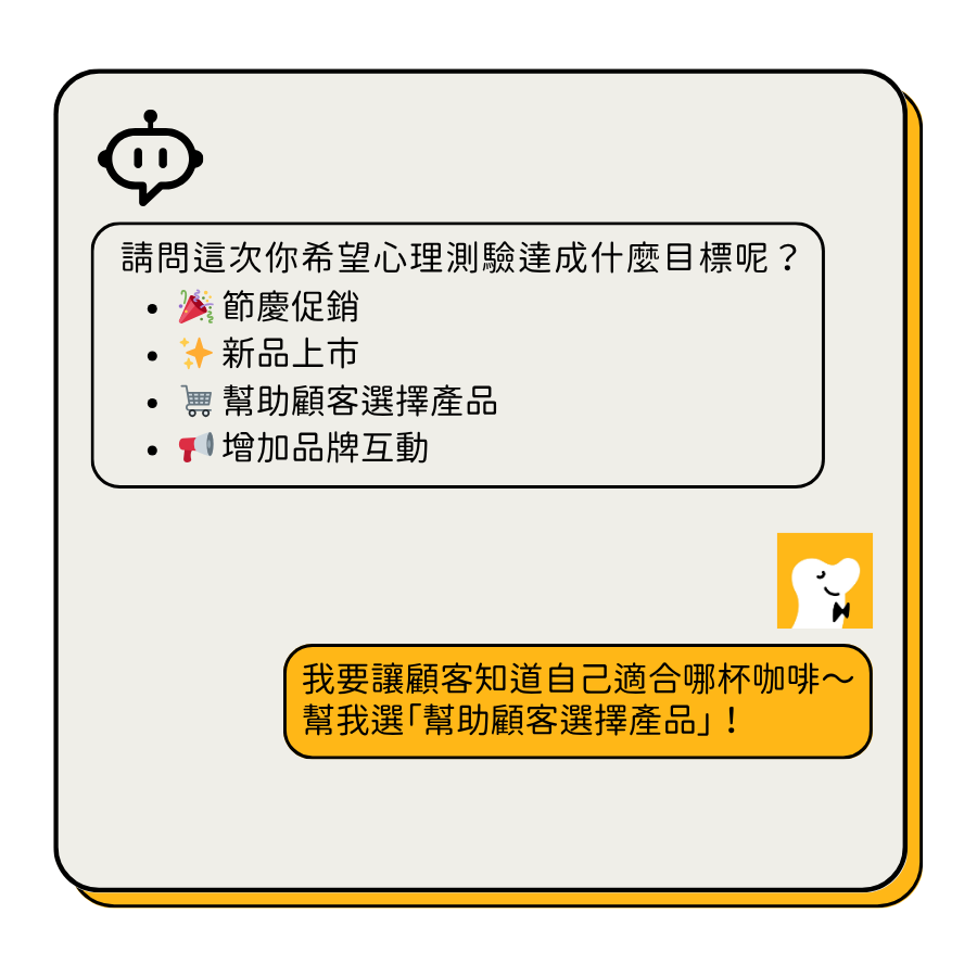 我們邀請品牌行銷人試用我們的「 AI 心測產生器」,只要簡單對話就能幫你生成高品質的心理測驗企劃腳本。不久的將來,我們將推出2.0版,讓你可以直接用 「一鍵建立心測」AI 幫手,讓 AI 企劃內容自動轉成可上線的後台模組,讓品牌上線活動更高效率!